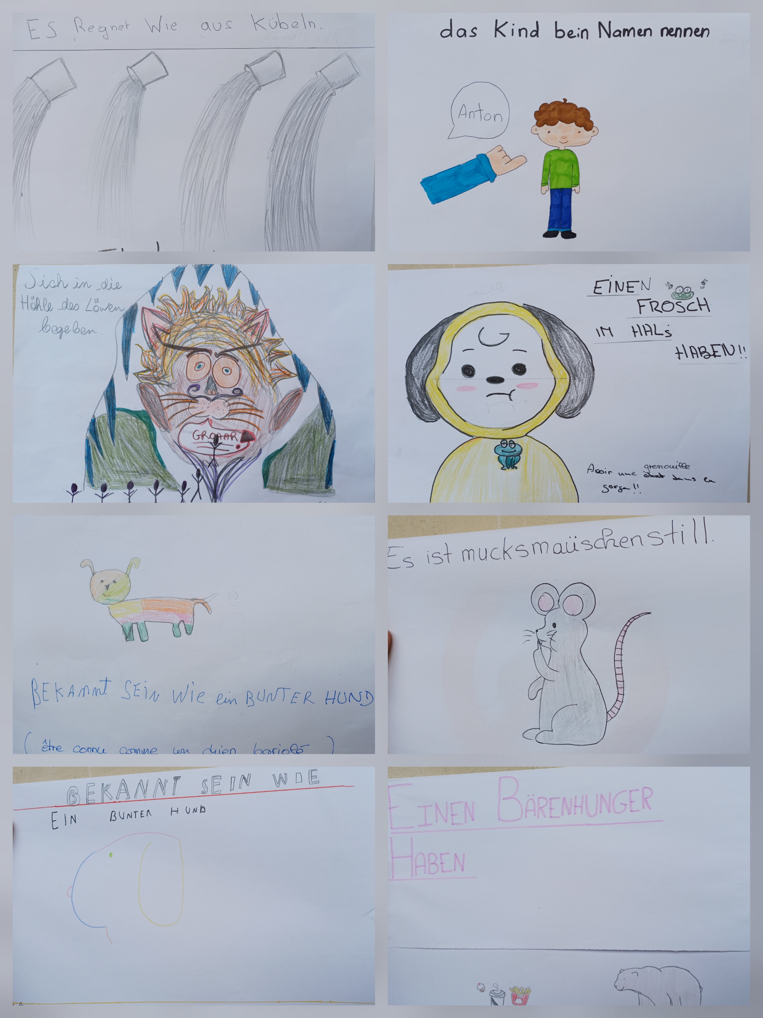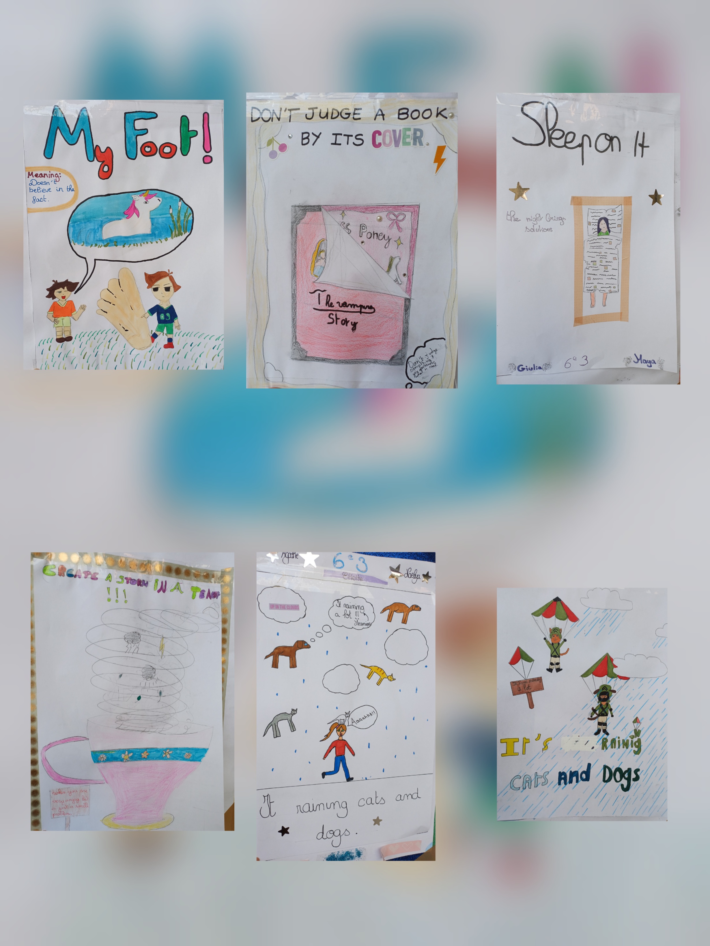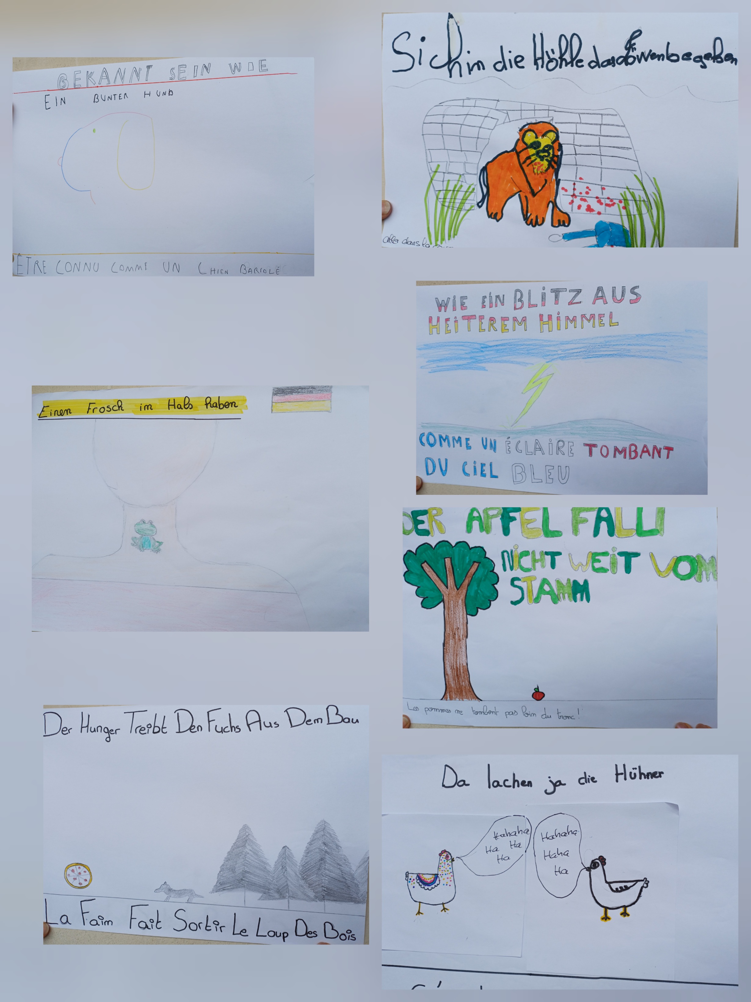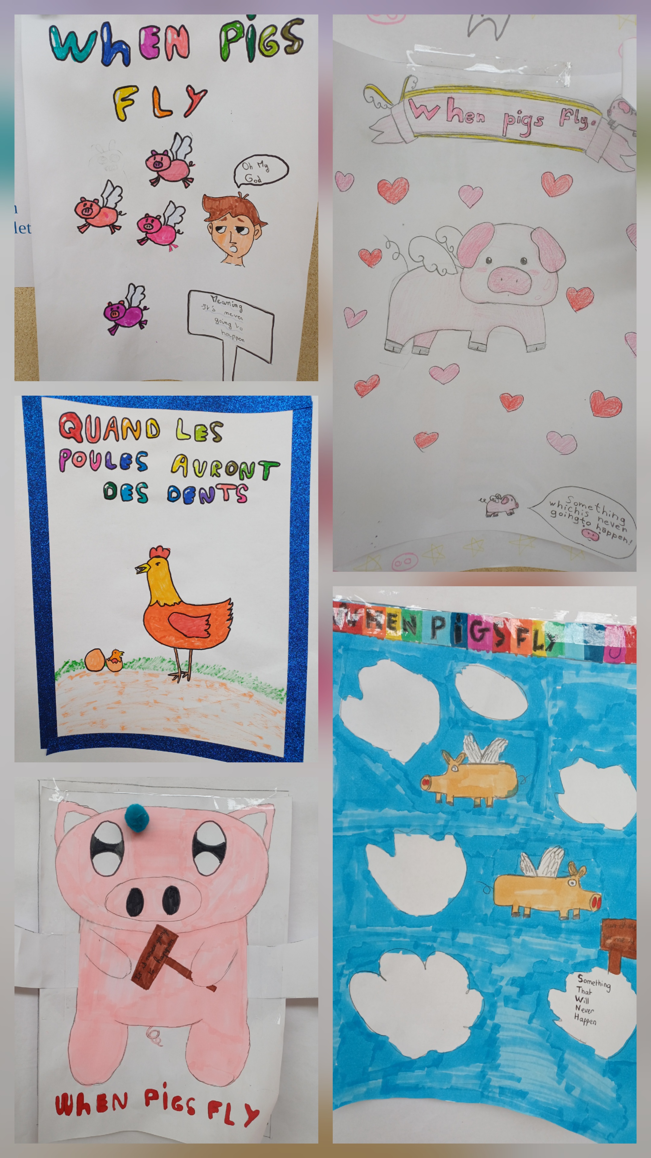 Par exemple, les élèves de la classe de 6ème Emile ont fait des affiches sur le thème des expressions idiomatiques en anglais et en français. Il y a un petit volet à soulever sur l'affiche pour voir l'expression française.