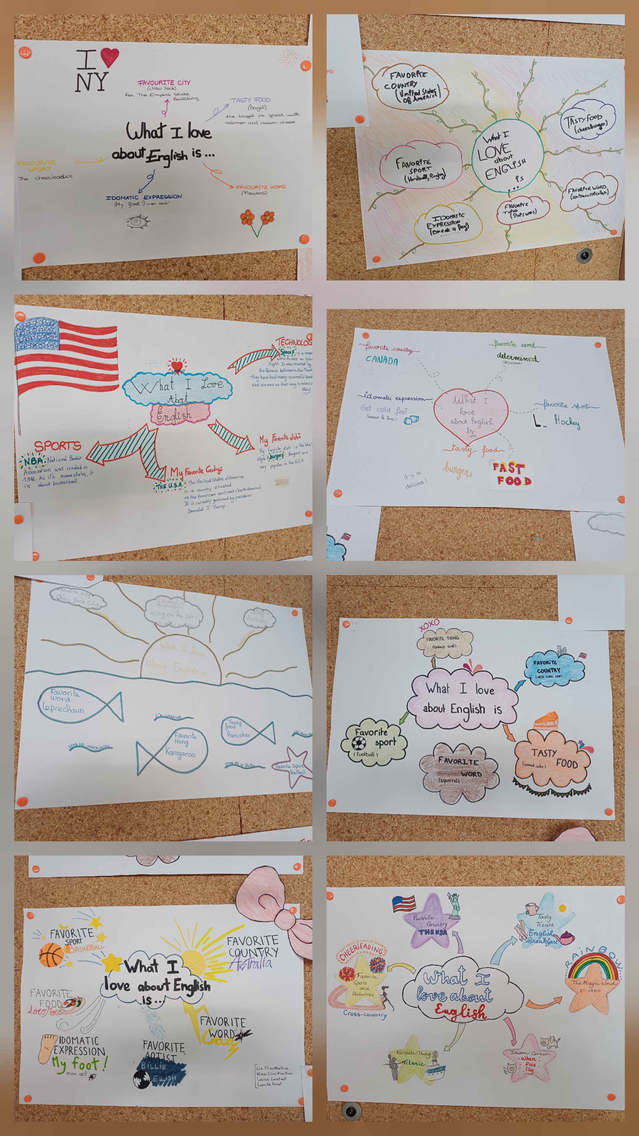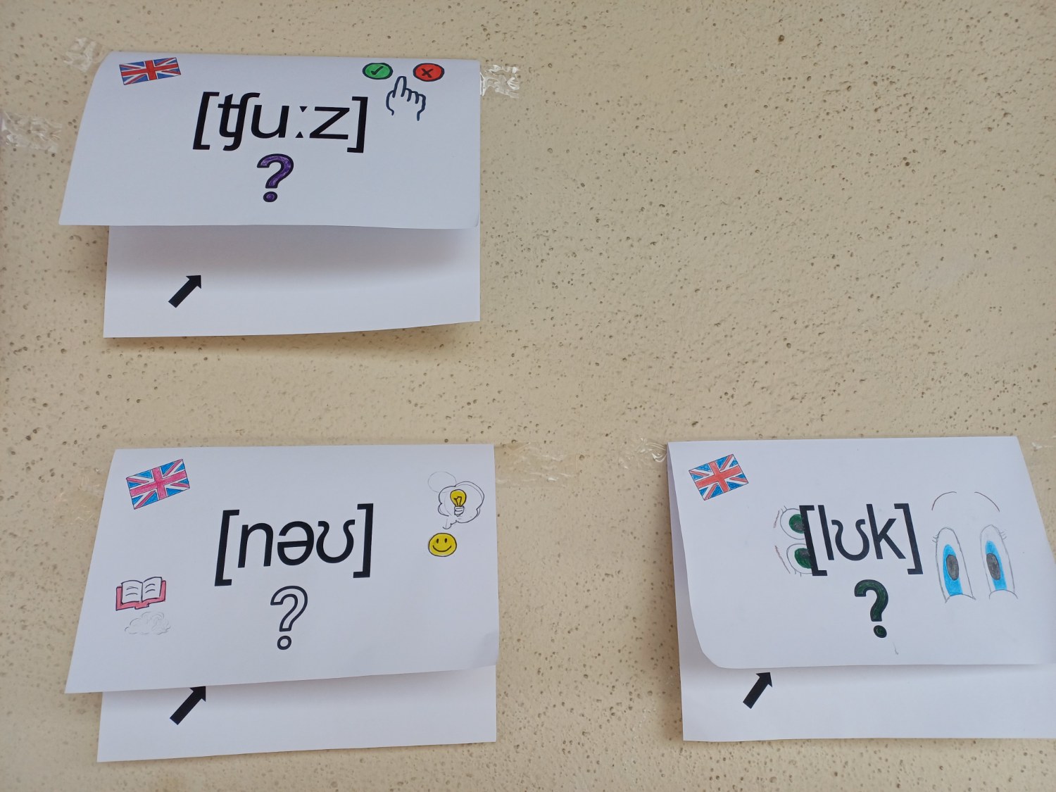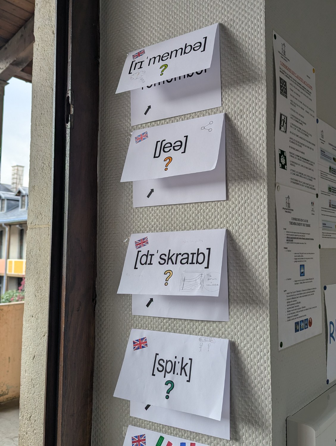 Il y a aussi des affiches réalisés par des élèves de 5ème et de 3ème pour faire deviner des mots écrits en phonétique où le petit dessin indique un indice pour trouver le mot écrit en phonétique et la réponse est écrit en anglais sous le rabat. Tous les mots concernent des consignes de classe.