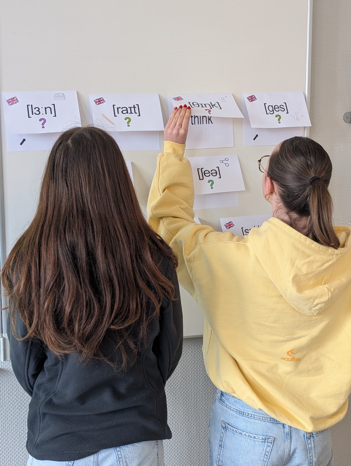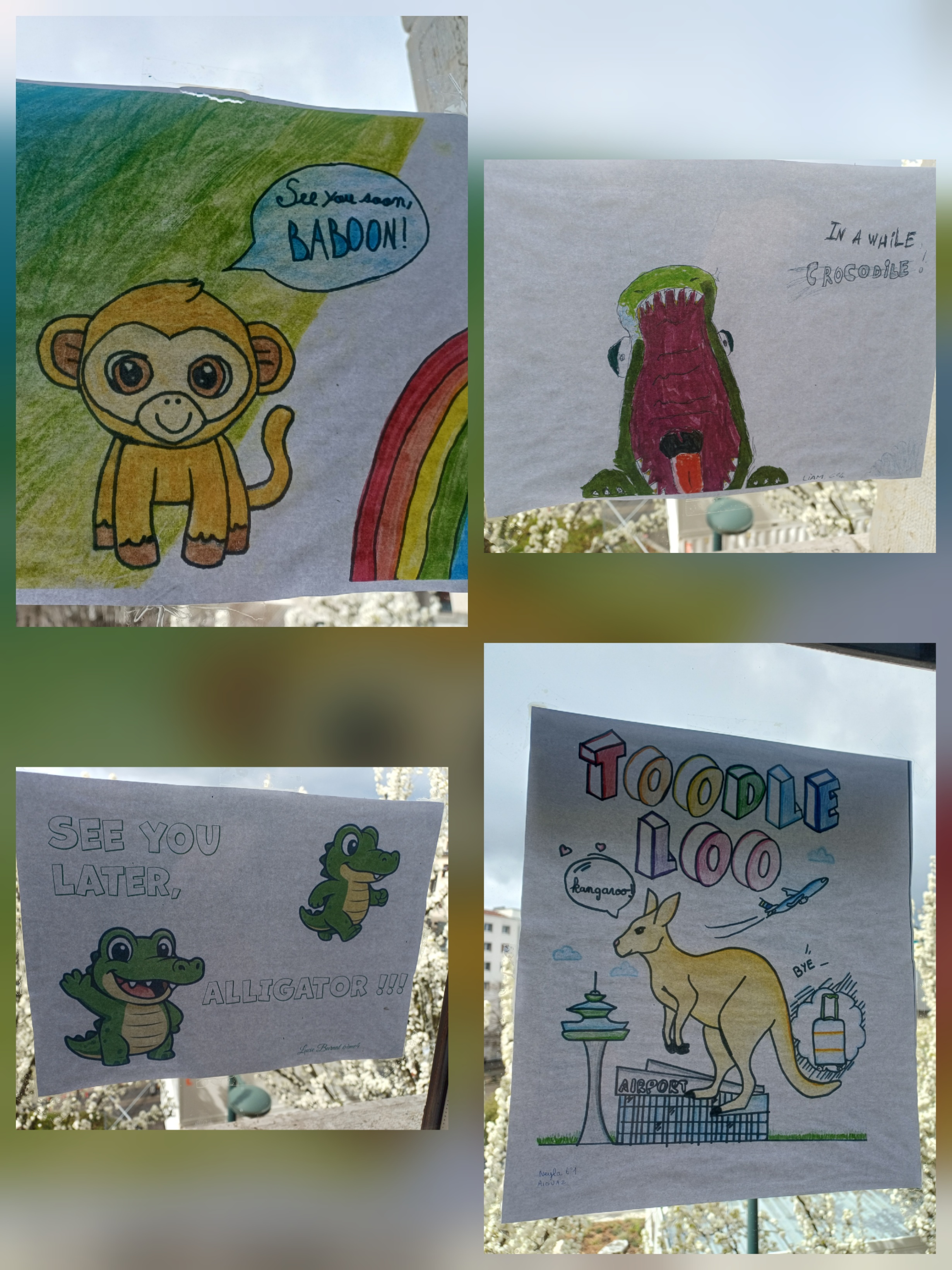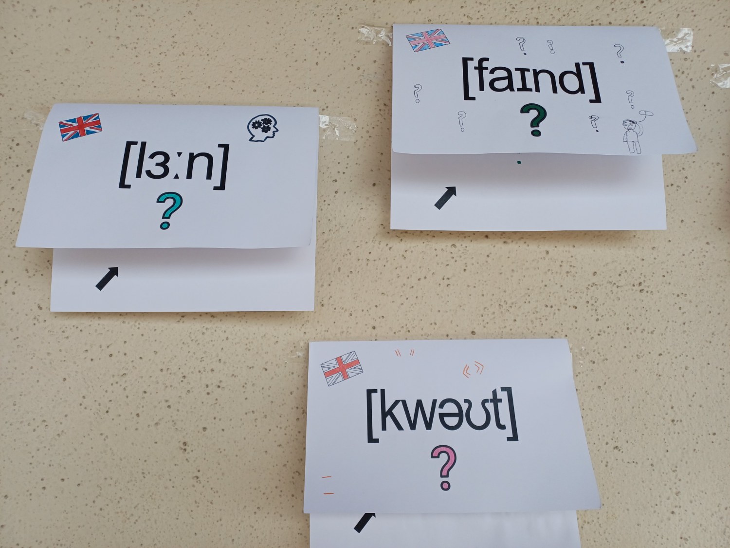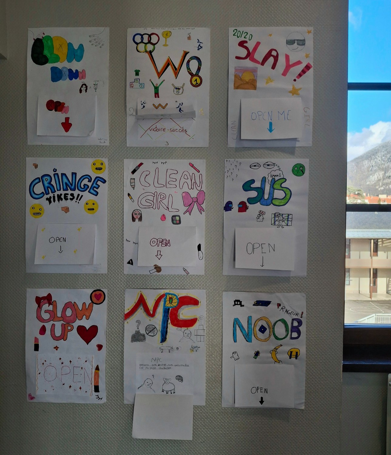 Il y a aussi des affiches réalisés par des élèves de 5ème et de 3ème pour faire deviner des mots écrits en phonétique où le petit dessin indique un indice pour trouver le mot écrit en phonétique et la réponse est écrit en anglais sous le rabat. Tous les mots concernent des consignes de classe.